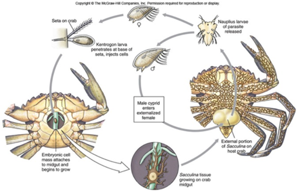 Sacculina carcini è un cirripede appartenente all’ordine Rhizocephala. Prima di raggiungere la fase adulta, questa specie va incontro a tre stadi larvali: nauplius, cypris e kentrogon. Ciascuna larva, per poter sopravvivere, attua una forma di endoparassitosi (Thresher et al., 2000), infettando differenti specie di granchio (l’ospite primario). La larva cypris inizialmente prende contatto con l’esoscheletro dell’ospite, sviluppando una forma dendritica che le consente di aumentare la propria superficie di assorbimento. In questo modo sottrae i nutrienti direttamente dall’ospite, fino alla metamorfosi nello stadio di kentrogon.