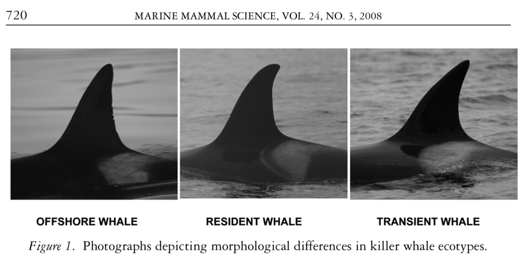 - Ecotipo offshore: descritto alla fine degli anni ’80 e ancora scarsamente conosciuto. La dieta di queste orche sembra comprendere quasi esclusivamente pesci cartilaginei e ippoglossi.