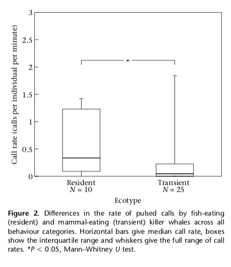 Una differenza che è stata oggetto di studio per molti etologi ed ecologi, è quella riscontrata a livello del tasso di vocalizzazioni emesse, che risulta essere significativamente maggiore nell’ecotipo residente, rispetto al transiente.