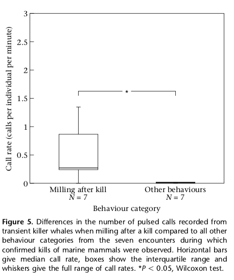 Questa differenza è probabilmente dovuta al costo aggiuntivo dei segnali vocali per le orche transienti, che cacciano prede con capacità uditive ben sviluppate. Le orche residenti invece si nutrono di pesce, che non possiede capacità sensoriali elevate quanto i mammiferi, pertanto non rischiano di essere intercettate e possono permettersi una comunicazione attraverso frequenti vocalizzazioni. A sostegno di questa ipotesi, si assiste ad un aumento della frequenza dell’emissione dei segnali vocali, successivamente a un attacco riuscito.