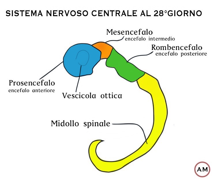Durante i primi giorni di vita, il sistema nervoso centrale si presenta a forma di tubo, per questo viene definito tubo neurale. Dato che la crescita delle varie parti che costituiscono il tubo neurale è disomogenea, le flessure e i restringimenti che mano a mano si creano contribuiscono a trasformarlo in un insieme di vescicole, che andranno a costituire le varie parti dell’encefalo e il midollo spinale. Queste vescicole sono visibili nel loro primo abbozzo già dal 28° giorno di vita dell’embrione: anteriormente si trova il prosencefalo, seguito dal mesencefalo, rombencefalo posteriormente e infine il midollo spinale (fig.1).