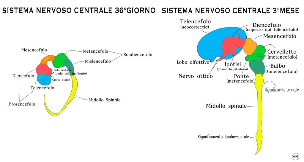 A destra il SNC al 3°mese. Dal Telencefalo si genera il lobo olfattivo. Internamente al Telencefalo è presente il Diencefalo di cui fanno parte il nervo ottico e l’ipofisi. Si nota il primo abbozzo del Cervelletto e del Ponte, sviluppati dalla vescicola Metencefalica. Il Bulbo (o Midollo allungato) deriva dallo sviluppo della vescicola Mielencefalica. Il Midollo spinale adesso presenta due rigonfiamenti, uno anteriore a livello cervicale e un altro posteriore a livello lombo-sacrale.