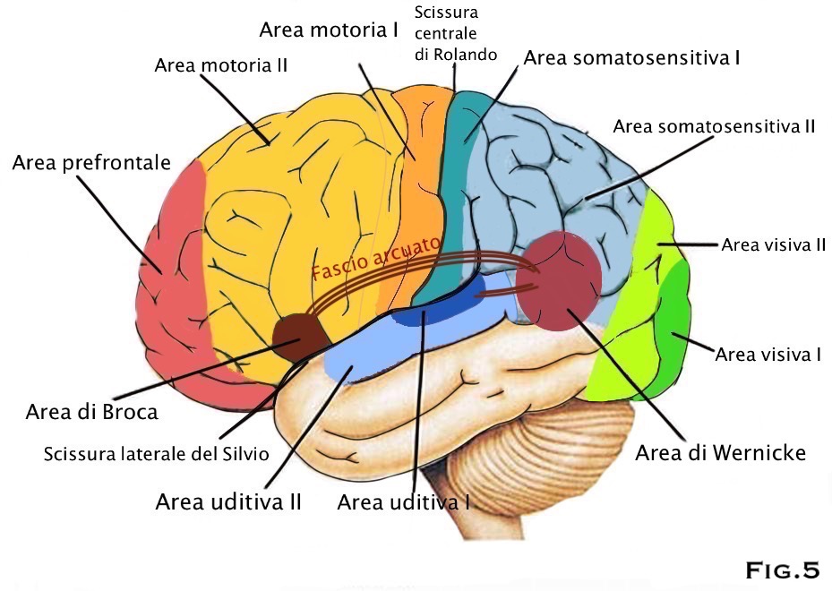 Nella fig.5 sono indicate due aree particolari presenti nell’emisfero sinistro (nella maggior parte delle persone è il dominante) del telencefalo, connesse attraverso il fascicolo arcuato (insieme di fibre nervose): una è l’area di Broca e l’altra è l’area di Wernicke. Queste due aree cerebrali sono deputate a modulare la funzione del linguaggio: cioè la capacità di codificare le idee in segnali del corpo o verbali (il parlato e lo scritto). L’area di Broca è un’area appartenente al lobo frontale, fondamentale per la produzione del linguaggio, ovvero la capacità motoria del parlato e dello scrivere; ci permette di elaborare le parole e comunicare attraverso di esse. Se questa area viene danneggiata si ha afasia di Broca non fluente, cioè una compromissione nella produzione del linguaggio, in cui però il soggetto rimane capace di comprenderlo, in quanto la sua area di Wernicke è intatta.