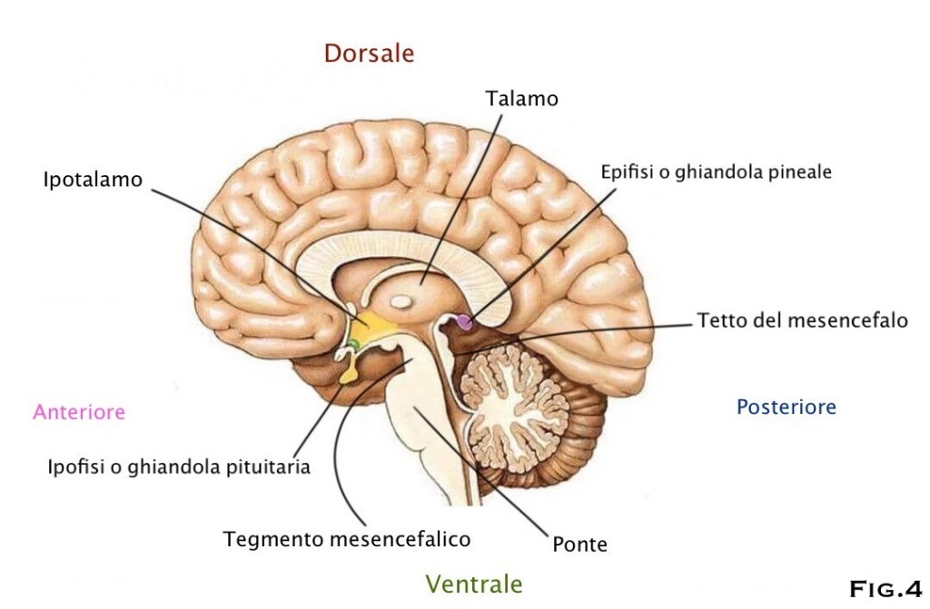 La seconda piccolissima porzione, posta ventralmente nel diencefalo, è l’ipotalamo, connesso tramite l’infundibolo all’ipofisi o ghiandola pituitaria (fig.4). L’ipofisi, si divide in neuroipofisi (o ipofisi posteriore) e adenoipofisi (o ipofisi anteriore). Grazie all’adenoipofisi si ha il rilascio di vari ormoni quali quello – importantissimo – della crescita e la prolattina (fondamentale per indurre l’allattamento nelle donne). La neuroipofisi attiva e mette in circolo ormoni quali la vasopressina (ormone antidiuretico) e l’ossitocina, un importantissimo ormone che induce la contrazione uterina durante il parto e che è implicato nell’allattamento e in comportamenti sociali quali l’accoppiamento (Moschetti A. et al., 2007).