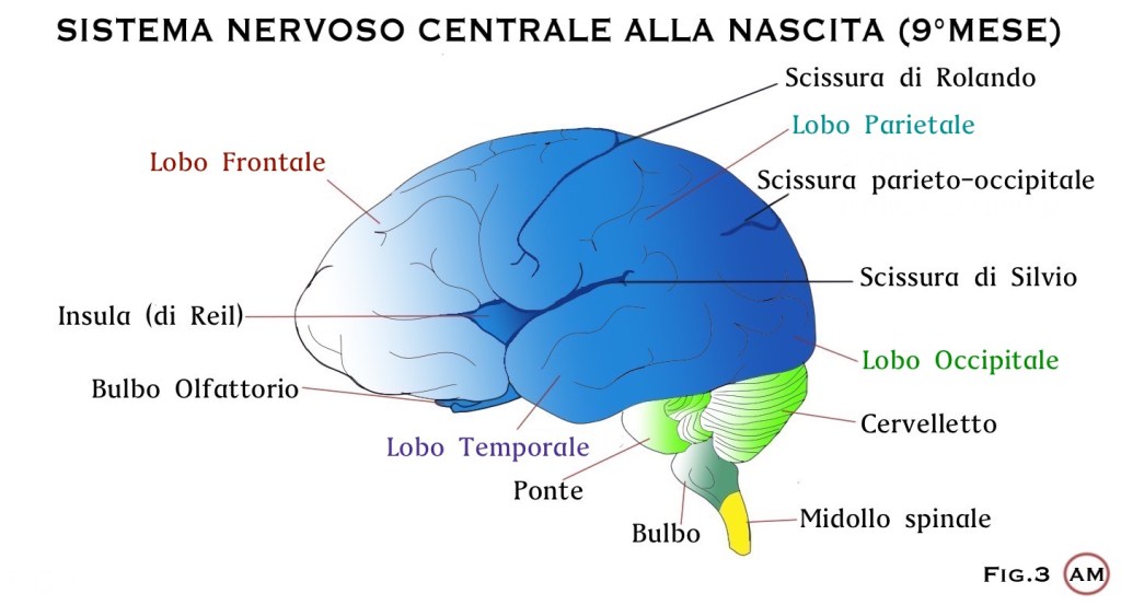 Dal 6° fino al 9°mese (fig.3) compaiono le circonvoluzioni che gradualmente si fanno sempre più numerose, sia a livello del cervelletto sia del telencefalo. Si individuano come ripiegamenti principali quelli che formano la scissura centrale (o di Rolando), la scissura parieto-occipitale e la scissura laterale (di Silvio). Queste tre scissure definiscono i quattro lobi principali che suddividono il telencefalo. A sinistra della scissura di Rolando si trova il lobo Frontale, mentre a destra della stessa il lobo Parietale, separato dal lobo Occipitale dalla scissura parieto-occipitale. La scissura di Silvio delimita invece il lobo Temporale. Divaricando i labbri della scissura del Silvio si individua un gruppo di circonvoluzioni che costituiscono il lobo dell’Insula, che rimane al di sotto dei lobi frontale, parietale e temporale.