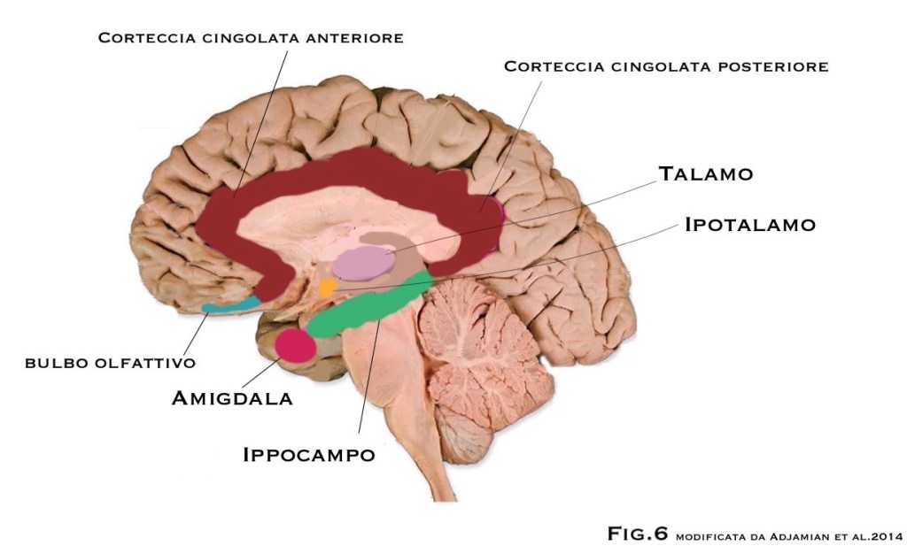 Il Sistema limbico (fig.6) è un insieme di strutture cerebrali interconnesse, quali quelle del telencefalo più profondo e antico, tra cui: l’ippocampo, la corteccia cingolata (o giro cingolato o cingolo) e l’amigdala, e anche strutture del diencefalo come l’ipotalamo.
