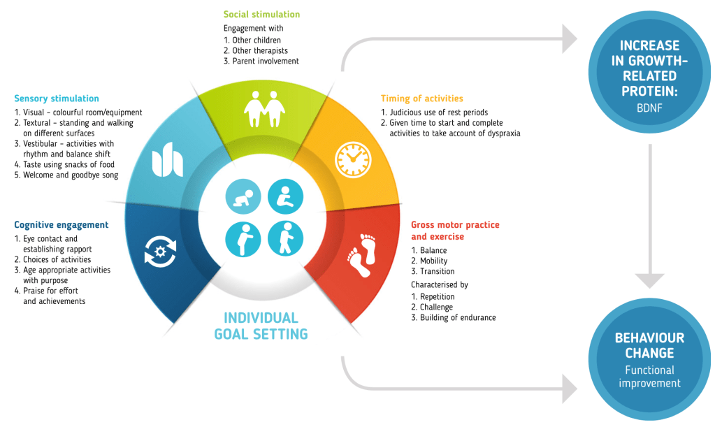Le bambine coinvolte in questo studio avevano un’età media di 3 anni e possedevano tra di loro diverse mutazioni a carico del gene MeCP2, pertanto non condividevano i medesimi livelli di deficit cognitivi e motori. L’intervento prevedeva l’esposizione ad un ambiente ricco di stimoli sensoriali e motori, in cui alle bambine venivano proposte principalmente attività di equilibrio e deambulazione, basate sull’apprendimento motorio. Ognuna di queste attività era svolta assieme almeno ad un terapista ed era integrata con esperienze visive (colori, giocattoli), uditive (canto), gustative (piccoli snack), vestibolari (spostamento dell’equilibrio) o tattili (differenti superfici su cui camminare o gattonare). Il protocollo prevedeva lo svolgimento di queste attività per 2 o 3 ore, 6 mattine a settimana, per un periodo di 6 mesi, durante il quale sono stati valutati eventuali differenze a livello delle capacità motorie e della quantità di BDNF.