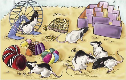 I topi e i ratti cresciuti in ambiente arricchito vanno incontro ad una precocizzazione dello sviluppo, rispetto ai topi di controllo, tenuti in ambiente standard. Nei topi adulti invece i principali effetti dell’ambiente arricchito riguardano l’aumento della neurogenesi ippocampale e l’efficacia sinaptica. Per questo motivo, protocolli di ambiente arricchito vengono utilizzati per valutare gli effetti in numerosi disordini neurocognitivi, quali: