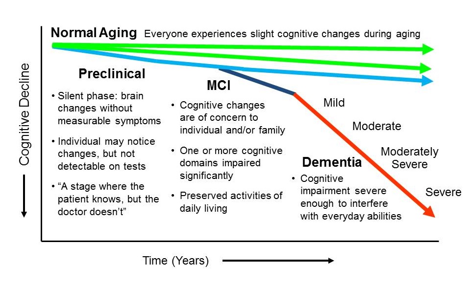 Per questo motivo, numerosi ricercatori cercano di individuare e di intervenire sui fattori di rischio modificabili. Sembrerebbe infatti che esista una lunga fase di transizione dall’aging fisiologico alla demenza, che, almeno durante i primi stadi, potrebbe essere reversibile. Si definisce quindi Mild Cognitive Impairment (MCI) una condizione di rischio per lo sviluppo di Alzheimer, caratterizzata da lievi deficit cognitivi (evidenziabili attraverso dei test specifici). Questa condizione non è deterministica, poiché una frazione notevole dei soggetti con MCI non manifesta successivamente i segni della malattia di Alzheimer.