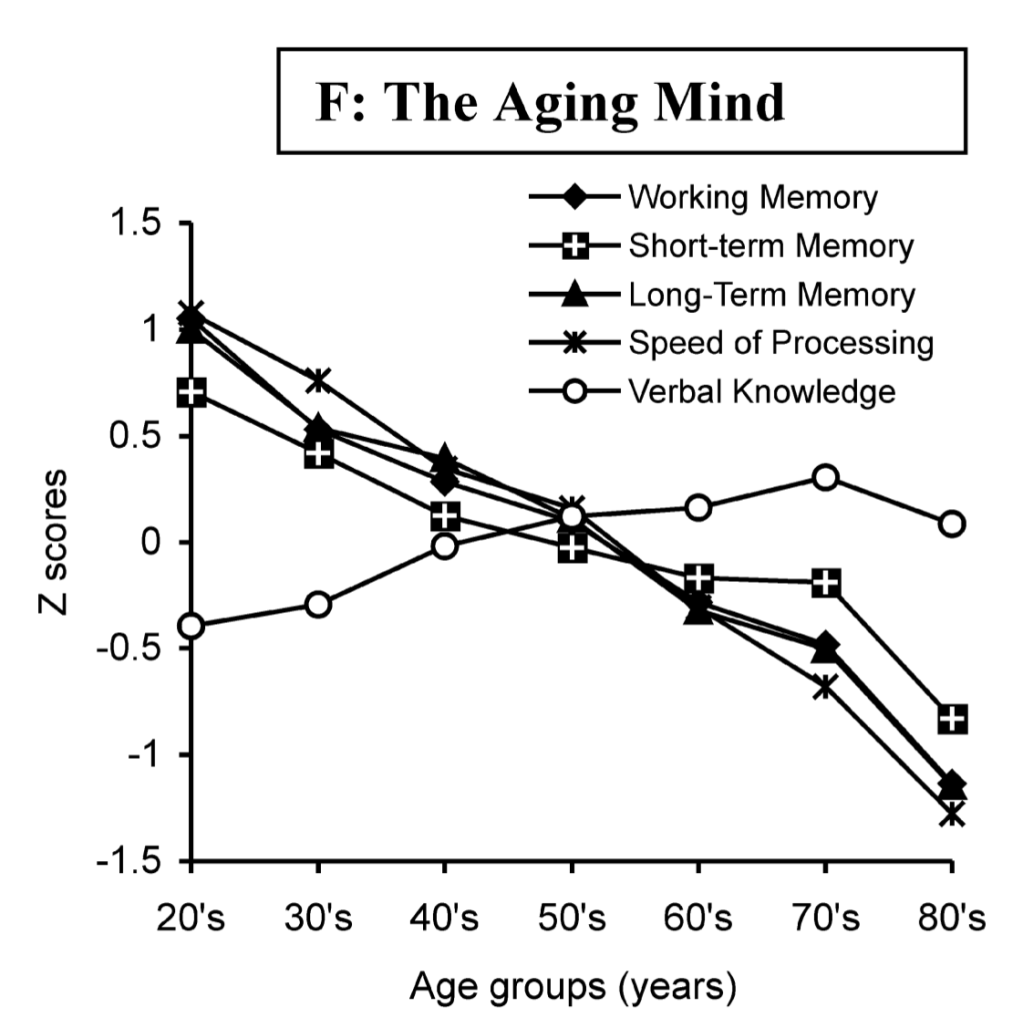 Allo stesso tempo però, alcune funzioni durante l’aging restano inalterate e, anzi, beneficiano delle conoscenze acquisite durante l’arco dell’intera vita di ciascun individuo. Ad esempio, l’ampiezza del vocabolario e l’abilità di trovare sinonimi e contrari (verbal knowledge) aumentano con l’avanzare dell’età (Park & Gutchess, 2002). Per questo motivo, negli ultimi anni è cresciuta l’idea che la popolazione anziana rappresenti un importante serbatoio di conoscenza del mondo.
