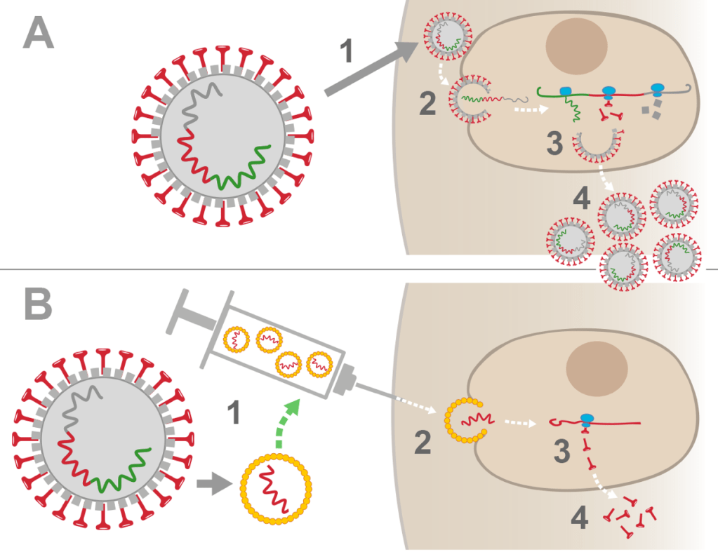- Vaccini a mRNA: altri vaccini (Kaur & Gupta, 2020) si basano sull’inoculazione di molecole di RNA-messaggero, contenuto in gocce lipidiche, che permette alla cellula di produrre la proteina virale riconosciuta dal sistema immunitario (appunto, l’antigene). Lo scopo non è quindi la permanenza del gene virale all’interno delle nostre cellule, ma, di nuovo, indurre una risposta immunitaria, successivamente alla quale l’mRNA viene degradato. L’mRNA non viene retrotrascritto, è incapace di entrare nel nucleo delle cellule e non può integrarsi col DNA cromosomico.
