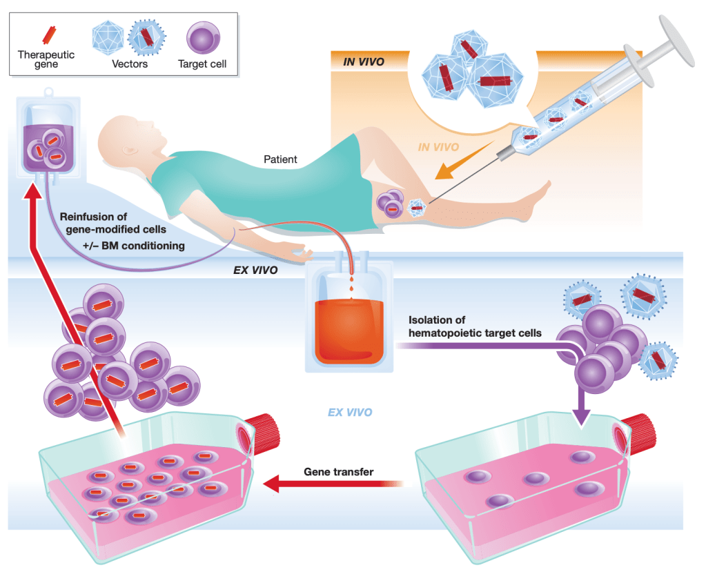 Principalmente, è possibile distinguere una terapia genica in vivo, in cui il gene terapeutico viene introdotto nel corpo del paziente (per esempio, a livello di specifici tessuti o organi). Le applicazioni ex vivo invece prevedono l’isolamento delle cellule del paziente, successivamente trattate e reintrodotte attraverso trapianto autologo.