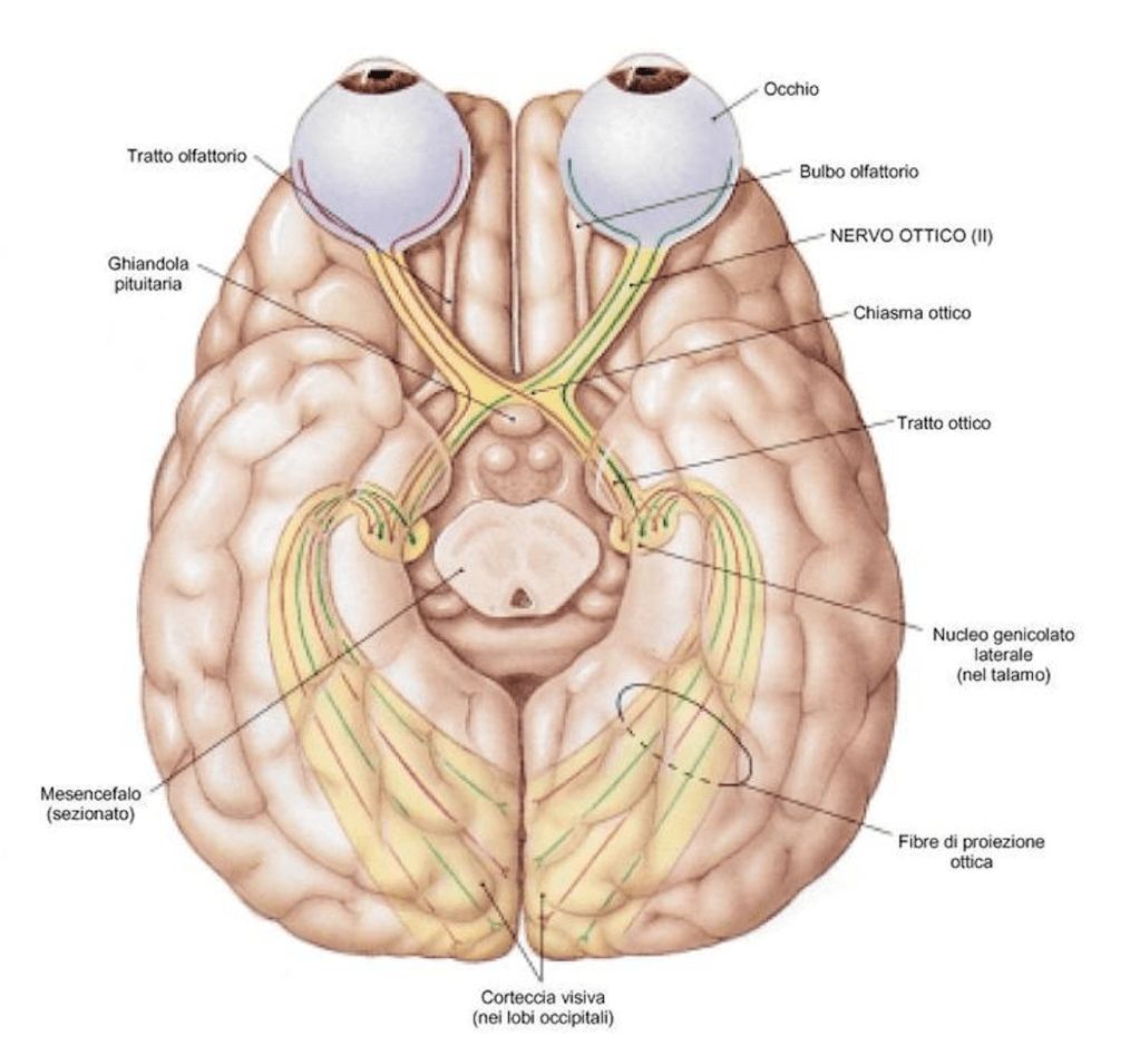 La via visiva inizia a livello della retina, un epitelio sensoriale dove i fotorecettori ricevono l’energia delle onde elettromagnetiche della luce e la trasformano in impulsi elettrici. Gli stimoli vengono trasmessi a gruppi di neuroni specifici e arrivano, attraverso il nervo ottico, al nucleo genicolato laterale e alla corteccia visiva primaria. Qui le immagini vengono elaborate ed inviate alle aree associative (corteccia visiva secondaria e terziaria), che analizzano, riconoscono ed interpretano quello che stiamo guardando. La nostra percezione e quindi le sensazioni che scaturiscono, non dipendono esclusivamente dall’immagine osservata, ma da un’integrazione di informazioni esterne ed interne.