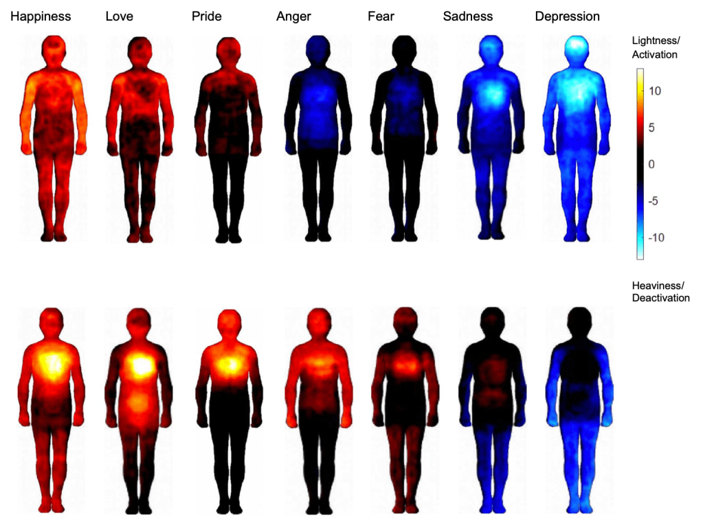 È interessante anche notare come due emozioni contraddittorie (felicità e tristezza) suscitino una sensazione corporea nella stessa regione (attivazione nel petto). Inoltre, a differenza della tristezza, per la depressione non è riportata una sensazione di attivazione nella parte superiore del corpo. Come mai quindi la tristezza, un marcatore sostanziale della depressione, induce una sensazione opposta ad uno stato strettamente collegato? I ricercatori affermano che una possibile spiegazione potrebbe essere che la tristezza provochi una forte pesantezza a livello del petto, che venga per questo motivo percepita come attivazione. Se la pesantezza diviene più intensa e cronica, come nel caso della depressione, provoca invece una sensazione di inattivazione.