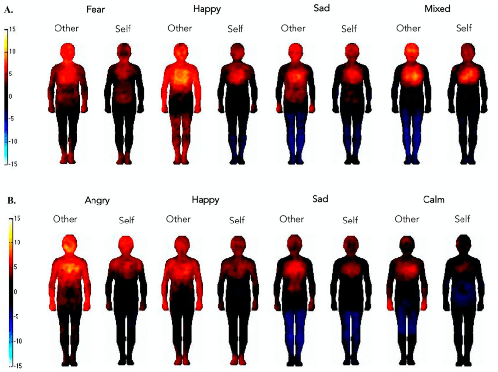 Nel 2019, Sachs e colleghi hanno condotto uno studio in cui adulti e bambini dovevano ascoltare brani musicali o guardare un filmati e poi servirsi della mappa corporea delle emozioni per riportare: la propria emozione e quella provata dall’interprete/attore. Gli autori di questo studio si sono soffermati sul calcolare il grado di sovrapposizione tra le mappe corporee proprie e quelle degli altri. Tale tratto sembra essere significativamente più sviluppato negli individui con uno spiccato lato empatico, che ad esempio sono più propensi ad adottare espressioni facciali associate al dolore, quando osservano un’altra persona che soffre. Ciò che definisce la distinzione tra il sé e l’altro sembra essere non la qualità dell’emozione, quanto la sua intensità: guardando un film o ascoltando una canzone, dovremmo attribuire una sensazione più forte all’interprete, rispetto a ciò che stiamo provando.