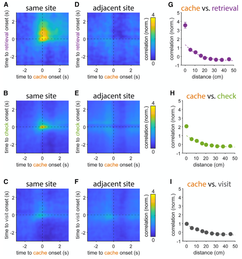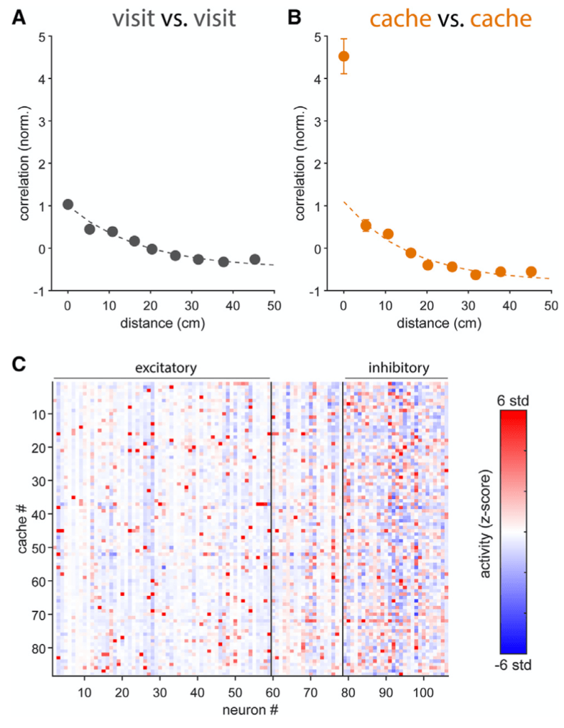 Gli autori hanno definito per ogni evento un vettore di attività della popolazione di neuroni, di modo da poter confrontare comportamenti attuati nello stesso sito e in siti diversi (Fig. 4A-B). Curiosamente, la correlazione tra questi vettori (visita-visita e provvista-provvista) decresce con la distanza tra i siti, coerentemente col comportamento delle cellule di posizione. Tuttavia, la correlazione provvista-provvista non è regolare, poiché in corrispondenza dello stesso sito raggiunge un valore notevolmente elevato. Questo suggerisce che nell’ippocampo ci siano due pattern di attività che coinvolgono la stessa popolazione di neuroni: