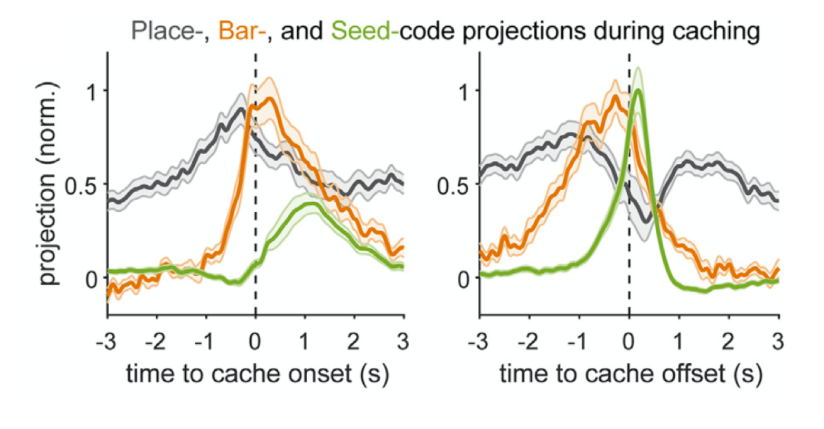 Cosa succede quando la cinciallegra apre la propria dispensa e trova ancora provviste? Le registrazioni elettrofisiologiche mostrano che, indipendentemente dalla posizione, quando la cinciallegra alza il coperchio solo per controllare, l’attività neurale diverge sulla base della presenza o meno di semi all’interno del sito. Gli autori quindi definiscono questo tipo di attività seed code (“codice dei semi”), per poterlo differenziare dal resto dei segnali. Questo consente di seguire il percorso temporale delle tre risposte identificate, durante le provviste (Fig. 6):