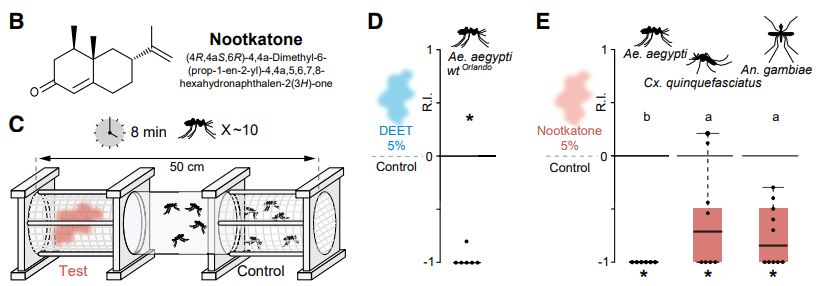 Il test di repellenza è stato svolto impedendo il contatto diretto con la sostanza in esame (nootkatone vs DEET, presente nella maggior parte dei repellenti antizanzara in commercio, come controllo positivo). A parità di concentrazione (5%) entrambe le sostanze hanno mostrato una significativa repellenza spaziale contro Ae. aegypti, mentre effetti inferiori si sono verificati contro C. quinquefasciatus e A. gambiae.