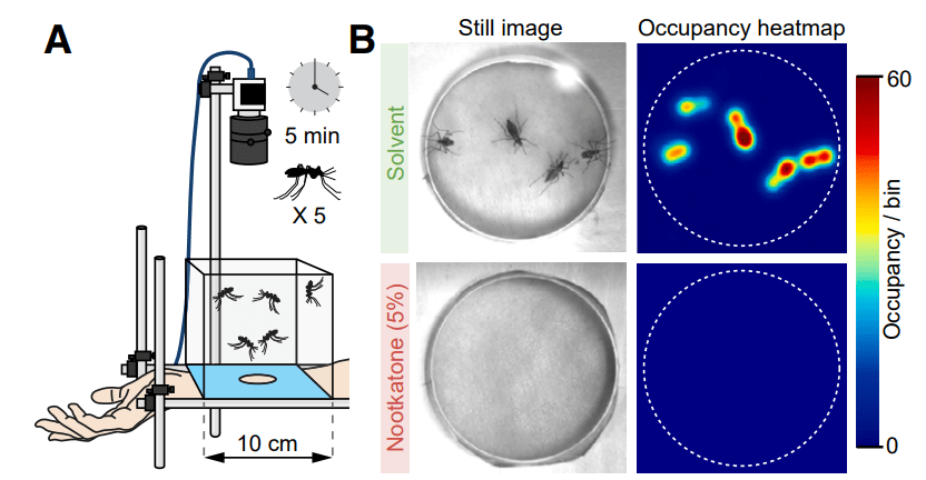 Mediamente, le zanzare atterrate sul braccio trattato con nootkatone rimanevano circa 6 secondi sulla pelle, tentando di alimentarsi, per poi ogni volta pulirsi vigorosamente la proboscide. Questo comportamento è in netto contrasto con quello innescato dal DEET, dove un breve contatto dei tarsi con la sostanza induce un rapido decollo. Nel complesso, questi esperimenti suggeriscono che l’avversione al contatto potrebbe essere mediata principalmente dalla proboscide.